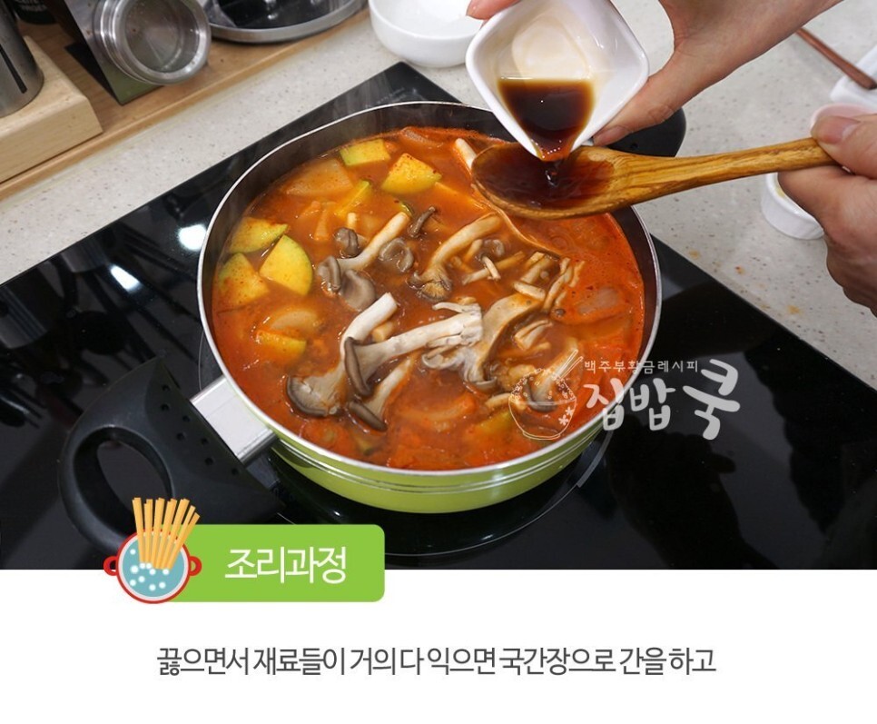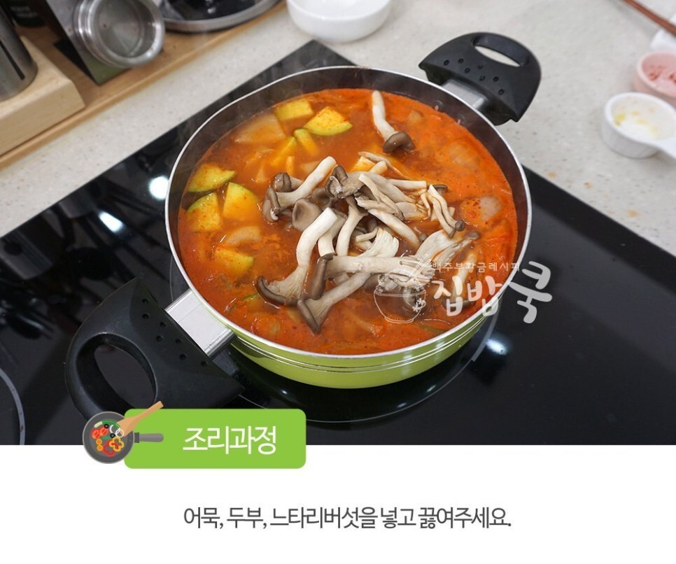 8. 다시 끓어오르기 시작하면 고춧가루와 다진 마늘을 넣어 풀어주시고 어묵, 두부, 느타리버섯을 넣고 한 번 더 끓여 주세요.