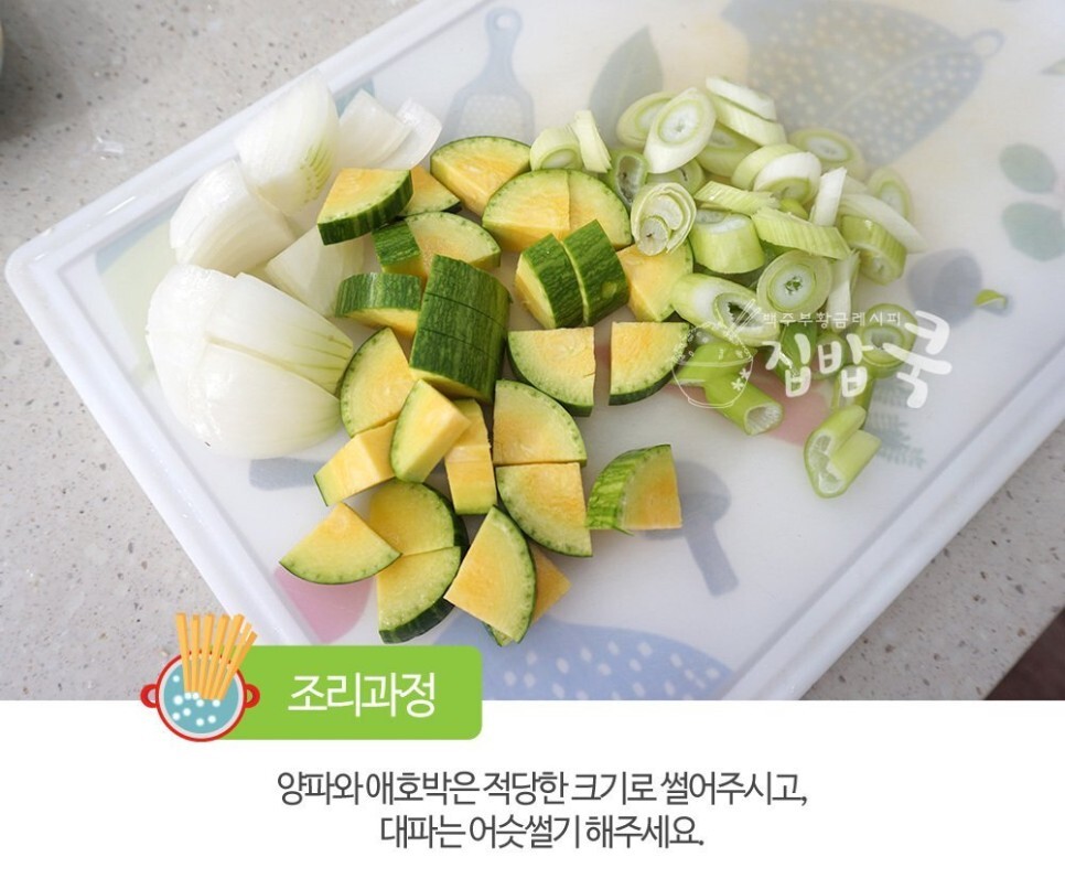 5. 양파와 애호박은 적당한 크기로 썰어주시고, 대파는 어슷썰기 해주세요.