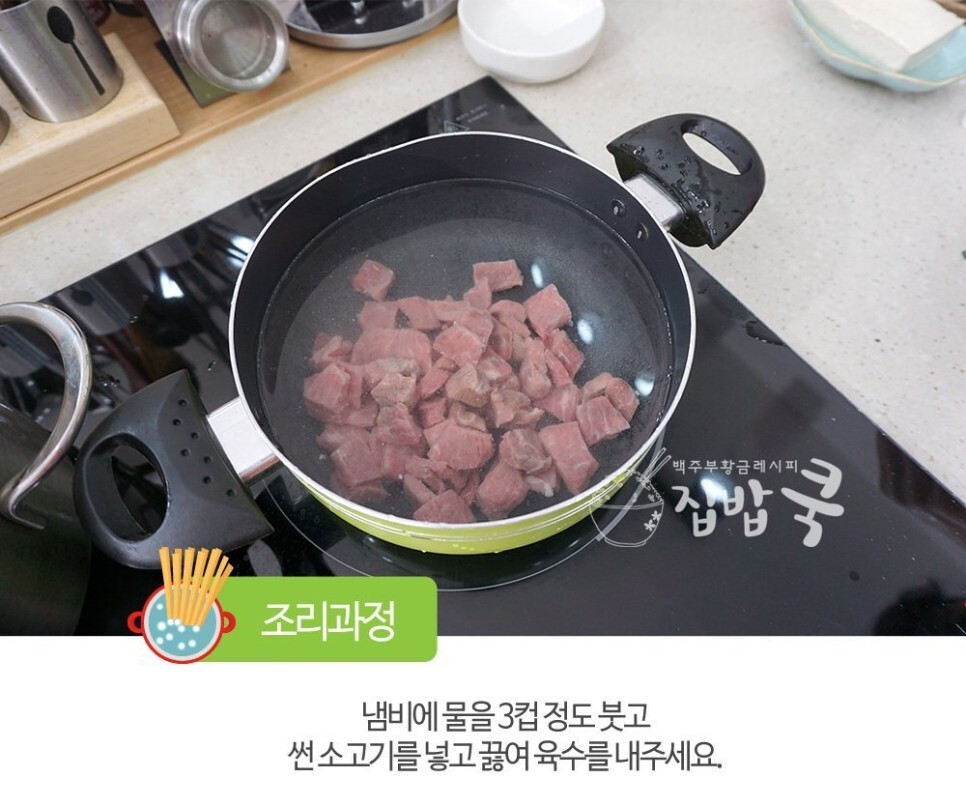 2. 냄비에 물을 3컵 정도를 부어주시고 손질된 소고기를 넣어 육수를 내주세요.