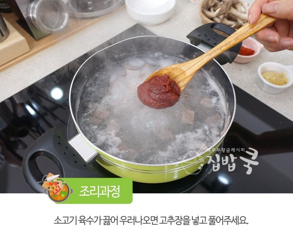 6. 소고기 육수가 끓어서 우러나오면 고추장을 넣고 풀어주세요.