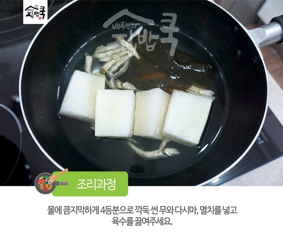 1. 냄비에 물을 붓고 큼지막하게 4등분으로 썬 무와 다시마, 멸치를 넣고 육수를 끓여주세요.