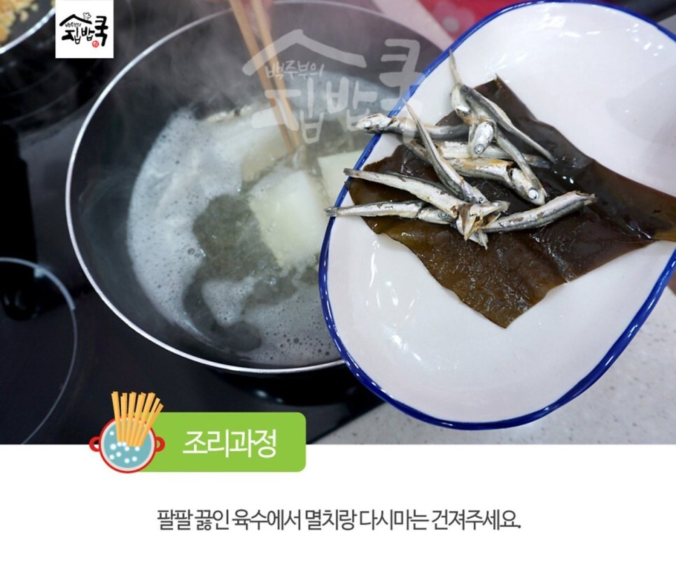 2. 팔팔 끓인 육수에서 멸치랑 다시마는 건져주세요.