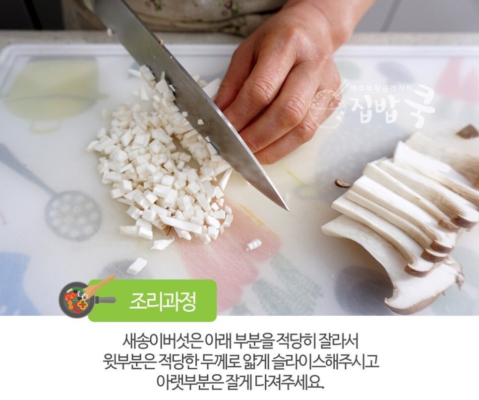 1. 새송이버섯은 아랫부분을 잘라서 머리 부분은 적당한 두께로 얇게 슬라이스 해주시고, 몸통 부분은 잘게 다져주세요.