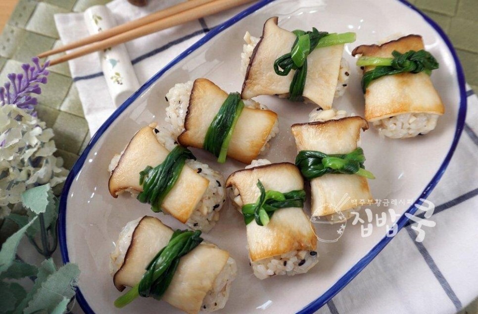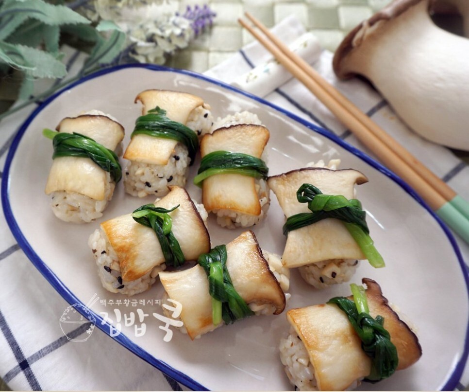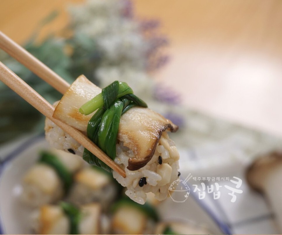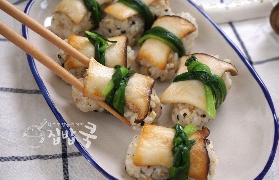 8. 주먹밥 위에 구워둔 새송이버섯을 올리고 데친 부추로 돌돌 말아 주시거나 매듭지어주시면 새송이버섯 주먹밥 완성!!