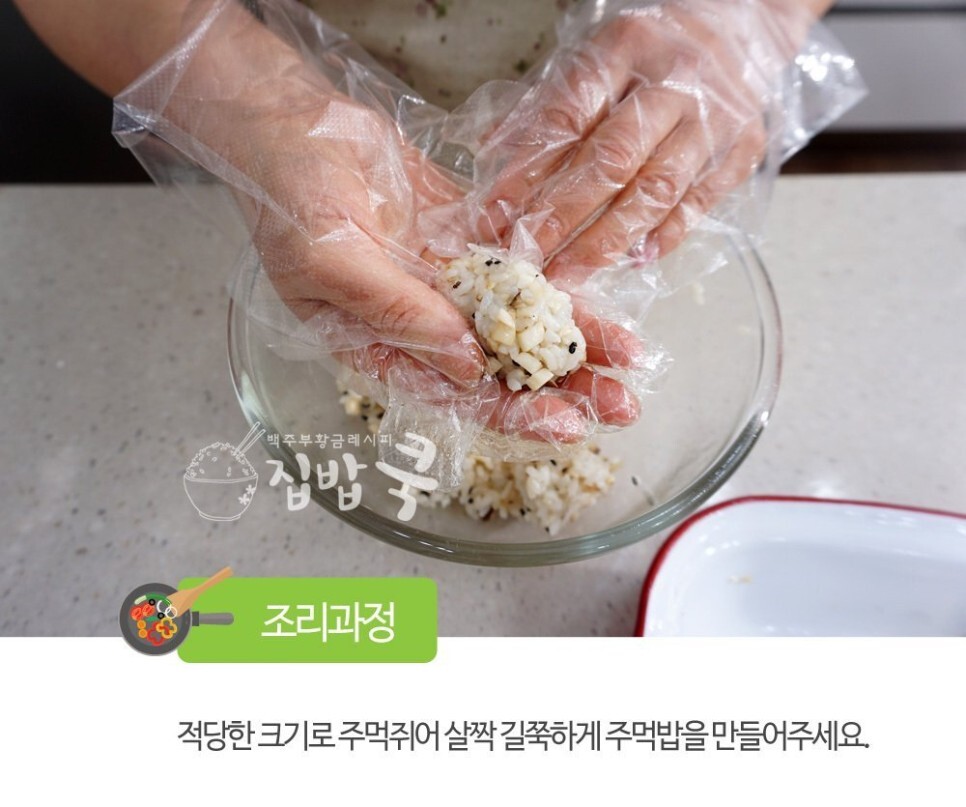 7. 적당한 한 입 크기로 주먹 쥐어 살짝 길쭉하게 주먹밥을 만들어주세요.