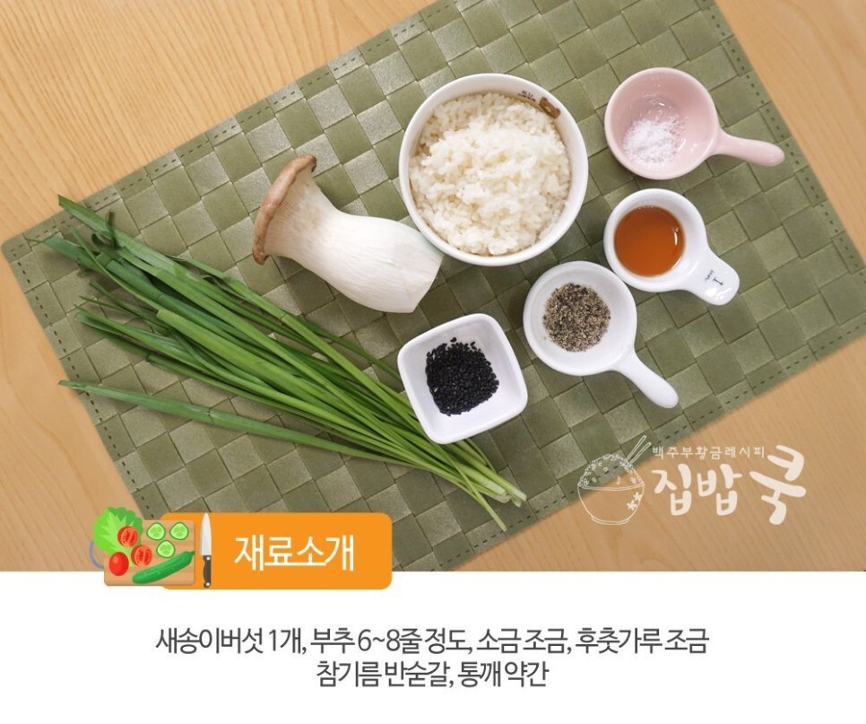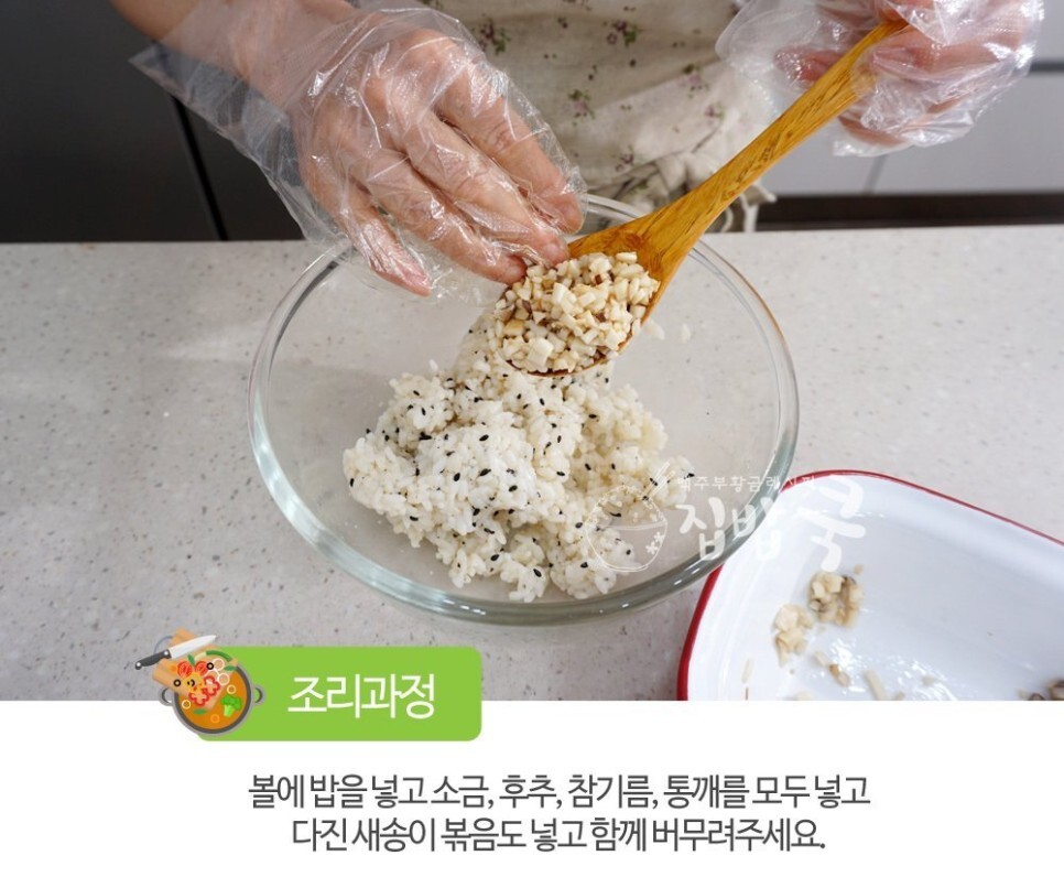 6. 볼에 밥을 넣고 소금, 후추, 참기름, 통깨를 모두 넣고 다져둔 새송이 볶음도(새송이버섯 몸통 부분) 넣고 함께 버무려주세요.