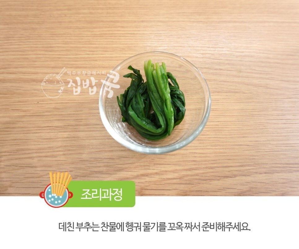 5. 데친 부추는 찬물에 헹궈 물기를 꼬옥 짜서 준비해주세요.
