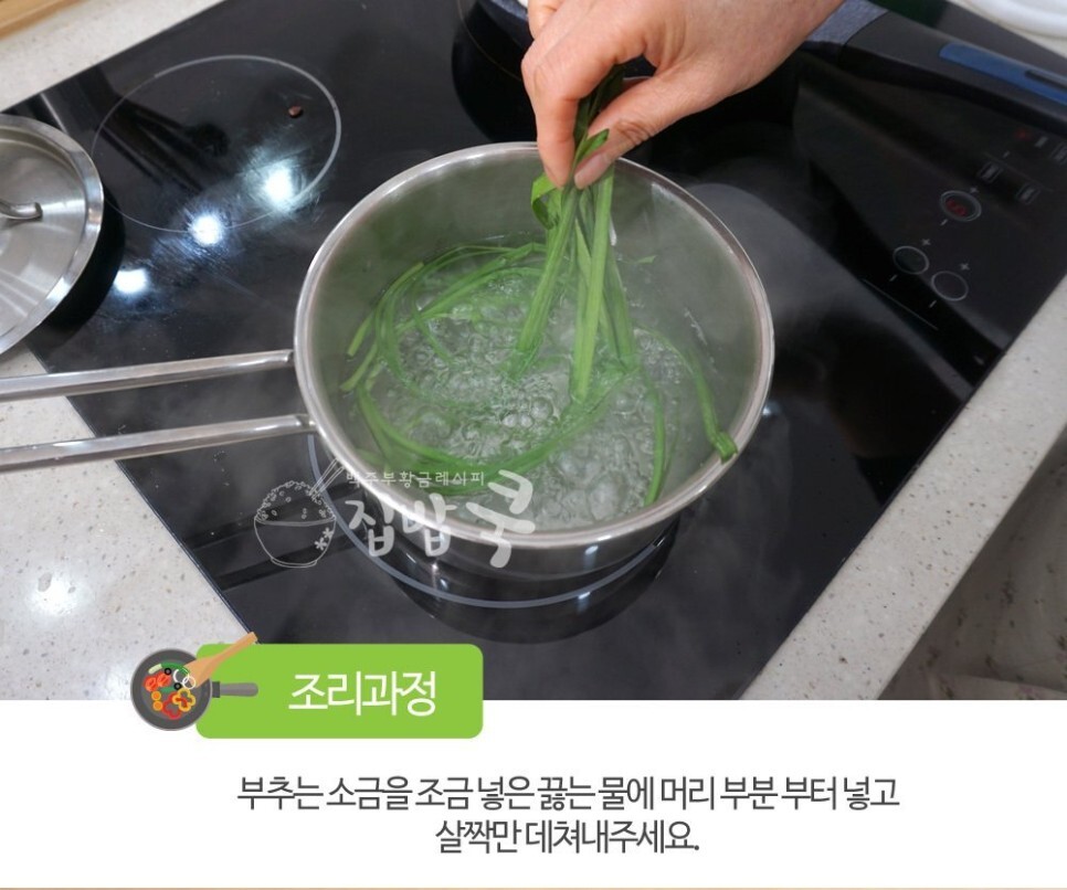 4. 부추는 소금을 조금 넣은 끓는 물에 머리 부분부터 넣고 살짝만 데쳐내주세요.
