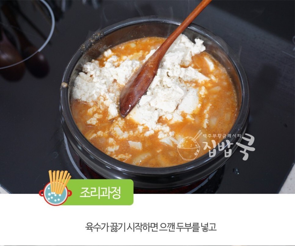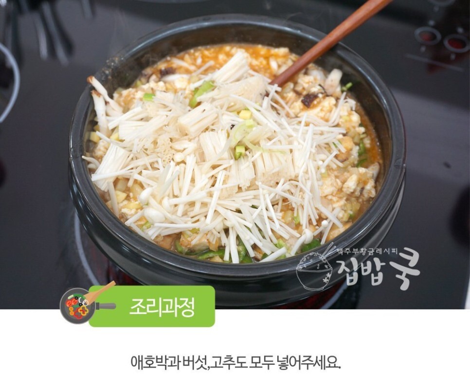 7. 육수가 끓기 시작하면 으깬 두부를 넣고 잘게 잘라두었던 애호박과 버섯, 고추도 모두 넣어주세요.