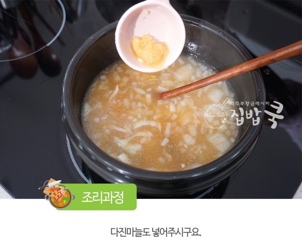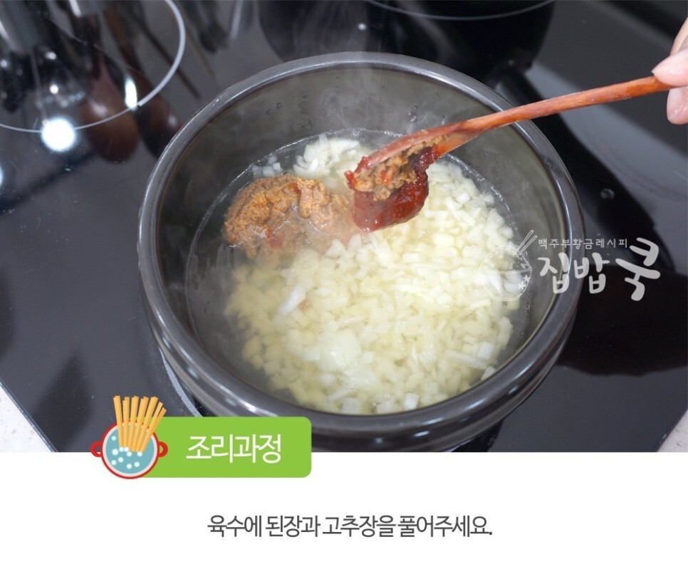 5. 육수에 된장 2 숟갈과 고추장 1 숟갈을 풀어주세요.