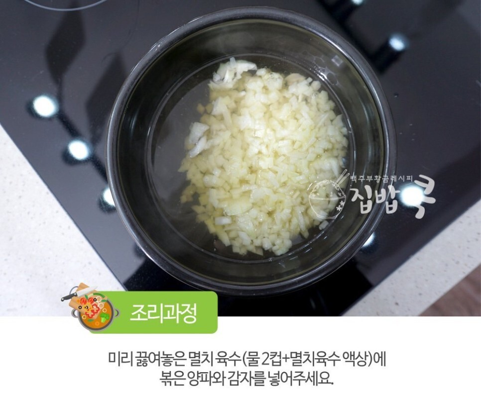 3. 미리 끓여놓은 멸치 육수(물 2컵 + 멸치육수 액상)에 볶은 양파와 감자를 넣어 주세요.