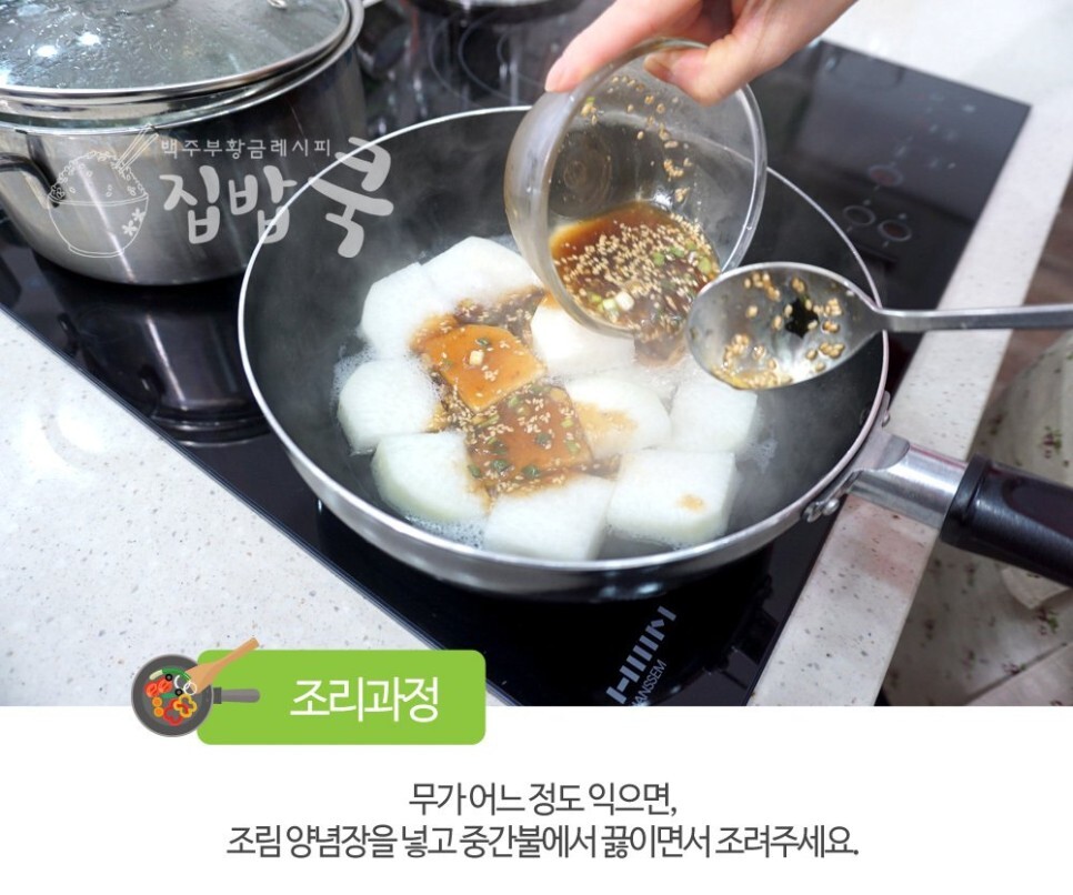 4. 무가 어느 정도 익으면 조림 양념장을 넣고 중불에서 끓이면서 조려주세요.