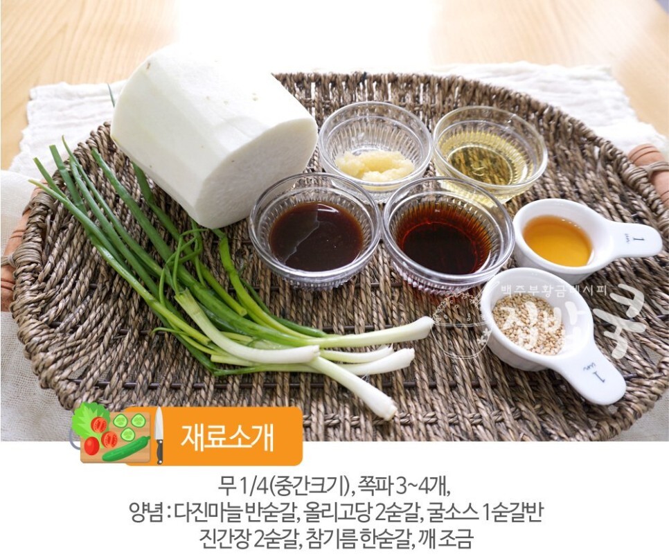 1. 무와 쪽파를 깨끗하게 세척하신 뒤 무와 쪽파를 사진과 같이 무는 적당한 크기로 큼직하게 썰어주시고 쪽파는 송송송 썰어 다져주세요.