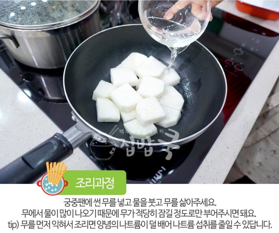 2. 궁중팬에 썰어두신 무를 넣고 물을 붓고 무를 삶아주세요. 무에서 물이 많이 나오기 때문에 무가 적당히 잠길 정도만 부어주시면 됩니다.