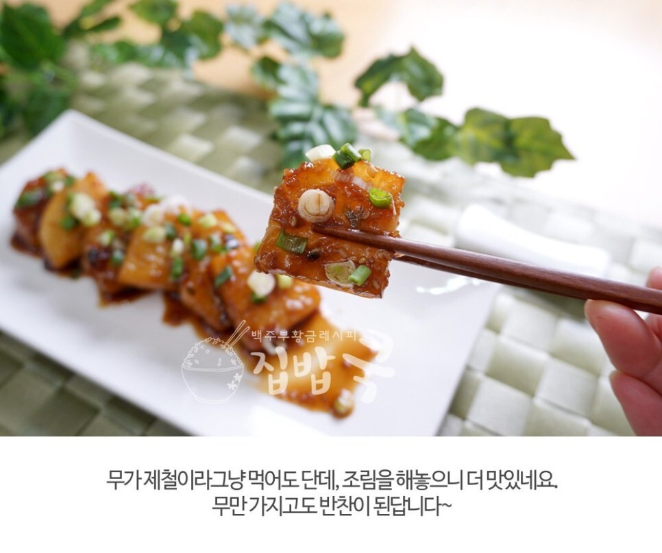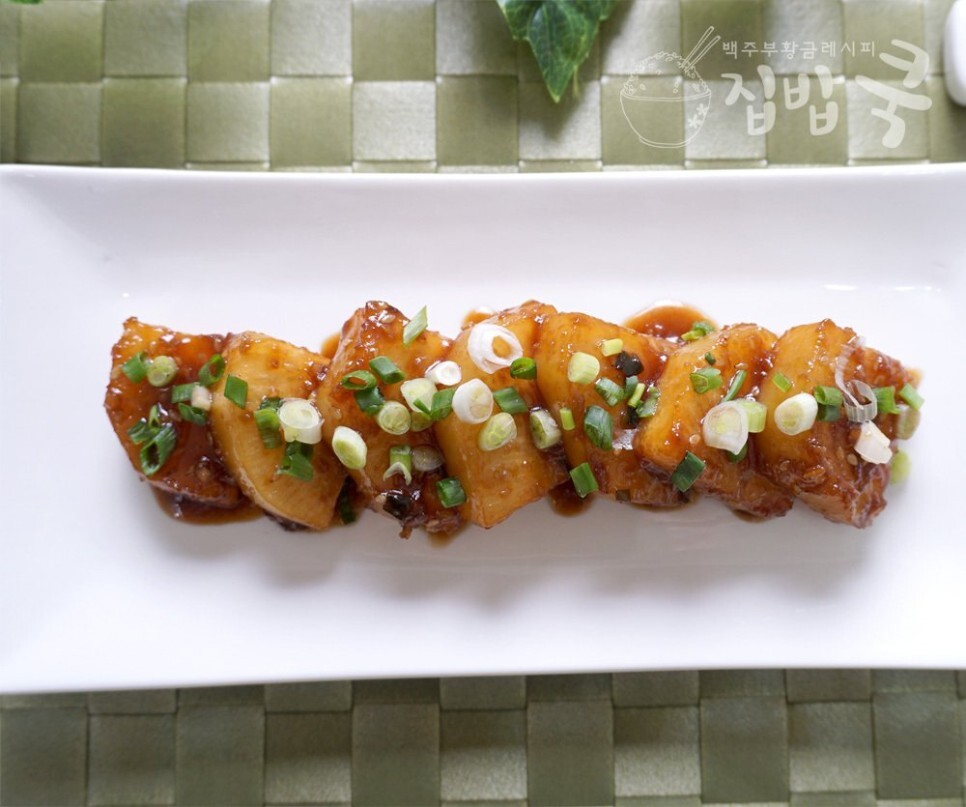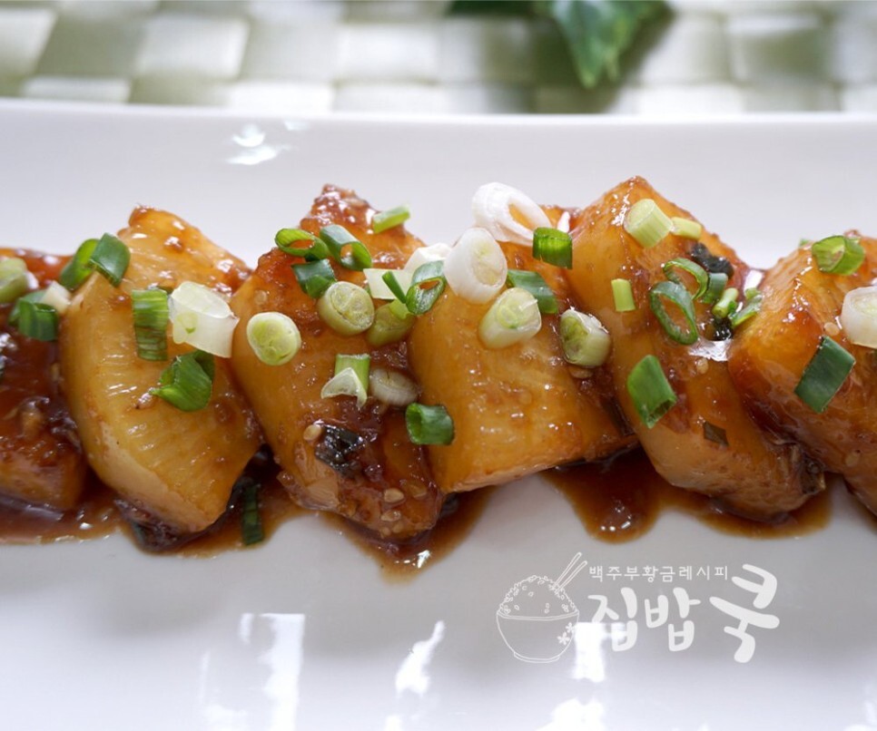 완성된 간장 무 조림을 접시에 예쁘게 담아주시고 남은 쪽파를 간장 무 조림 위에 솔솔 뿌려주시면 보기에도 너무 이뻐요~! 10월부터 제철인 무를 조림 양념장을 만들어서 집 반찬으로 만들어 두니깐 너무 맛있네요 이렇게 제철 식재료만 가지고 맛있는 반찬이 될 수가 있어요~! 많은 조리법과 다양한 식재료가 필요 없이 마트에서 무하나 사서 오늘 저녁은 간장 무 조림으로 가족들과 즐거운 한 끼 식사를 해보시는건 어때요? 그럼 다음에도 맛있는 이야기를 들고 찾아오겠습니다. 감사합니다.