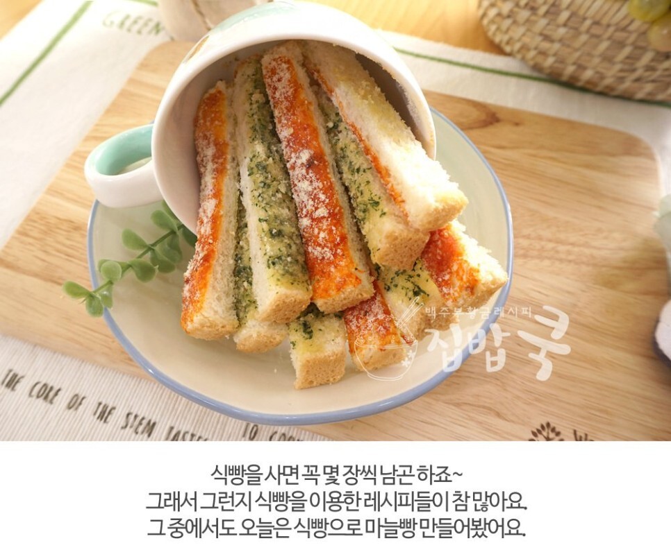 안녕하세요! 오늘 준비한 레시피는 "식빵 갈릭 스틱"입니다. 이상하게 식빵 하나 사면 다 먹을 때도 있지만 가끔씩 몇 개씩 남을 때가 많죠.. 몇 개 버리는 건 너무 아깝잖아요 그냥 먹자니 심심하고 맛도 없고.. 그래서 오늘은 그 남은 식빵 혹은 샌드위치를 만들고 남은 식빵 모서리 부분을 활용한 마늘빵 레시피입니다. 사실 개인적으로 마늘빵을 굉장히 좋아하는데요 아이들 간식으로도 좋고 입이 심심할 때 한 개씩 한 개씩 계속해서 꺼내 먹게 되는 모습을 보시게 될 거예요