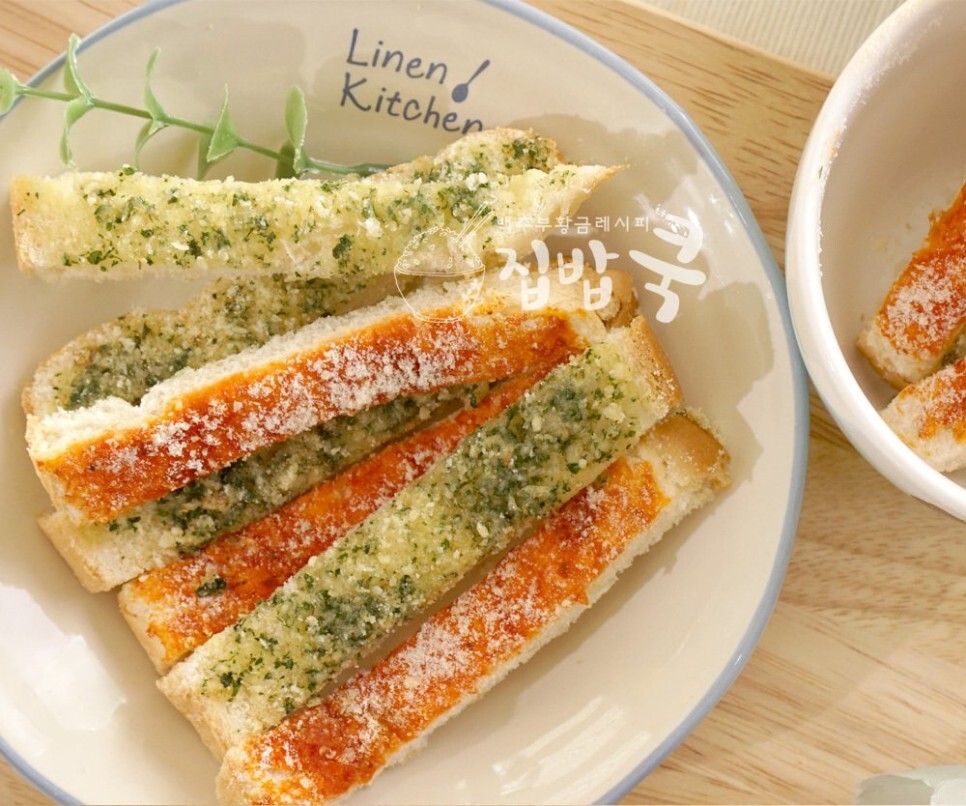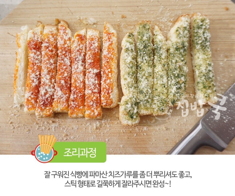 7. 잘 구워진 식빵에 파마산 치즈가루를 좀 더 뿌리셔도 좋고 스틱 형태로 길쭉하게 잘라주시면 갈릭 스틱이 완성~!