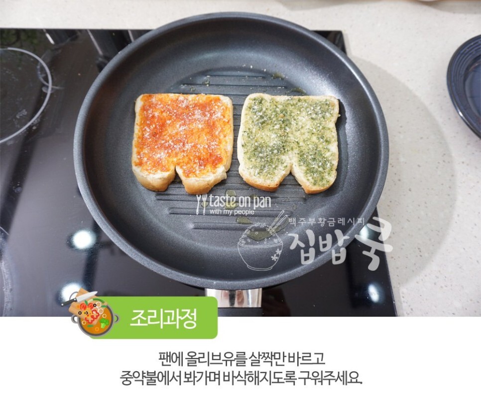 5. 팬에 올리브유를 살짝만 두르고 중약불에서 바삭해지도록 구워주세요 가정에 에어프라이어가 있으면 더욱 손쉽게 조리가 가능합니다.